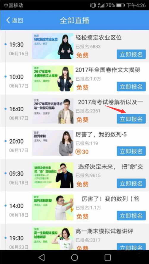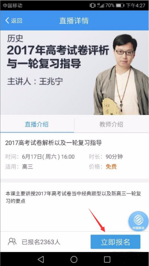 2、然后,在升学e网通的直播课程列表中,用户找到自己想要看的直播课程,点击“立即报名”按钮。比如,本文中是选择王兆宁的课程。