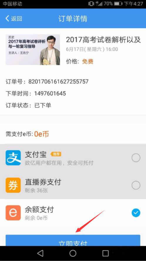 4、接下来,会自动跳转到升学e网通的订单支付页面,用户查看订单详情信息无误后,点击“立即支付”按钮。
