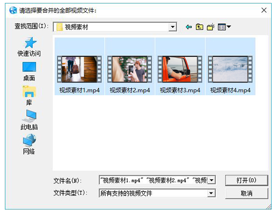 弹出对话框,选择需要合并的视频文件,点击【打开】,导入视频素材,