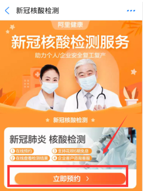 进入新冠核酸检测服务窗口,点击【立即预约】按钮,