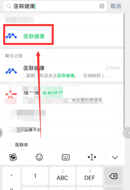 打开手机微信,进入界面,在搜索框中输入【医联健康】,得出查询结果,如图,点击相关公众号,
