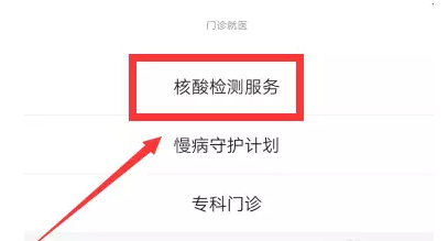 打开医联健康公众号,如图,点击左下角【门诊就医】,出现菜单,选择【核酸检测服务】,