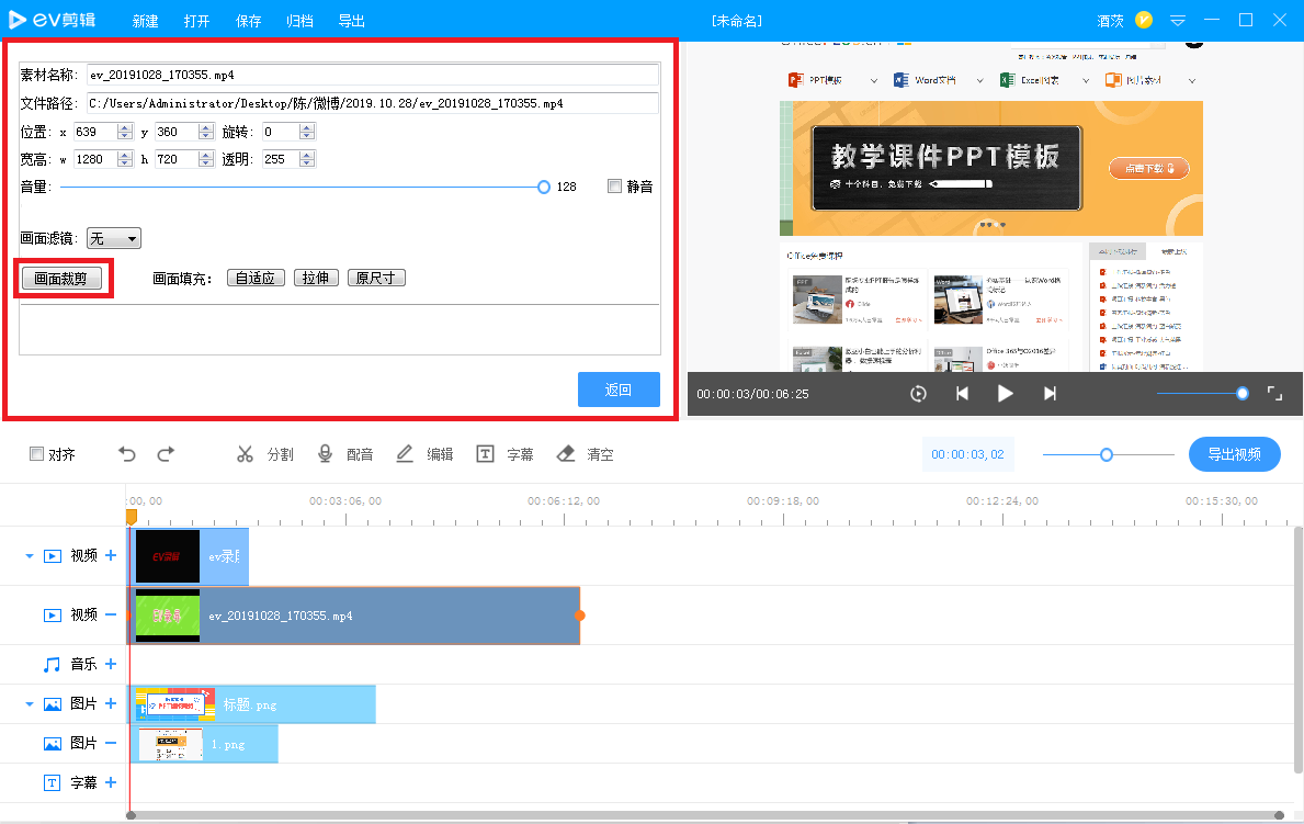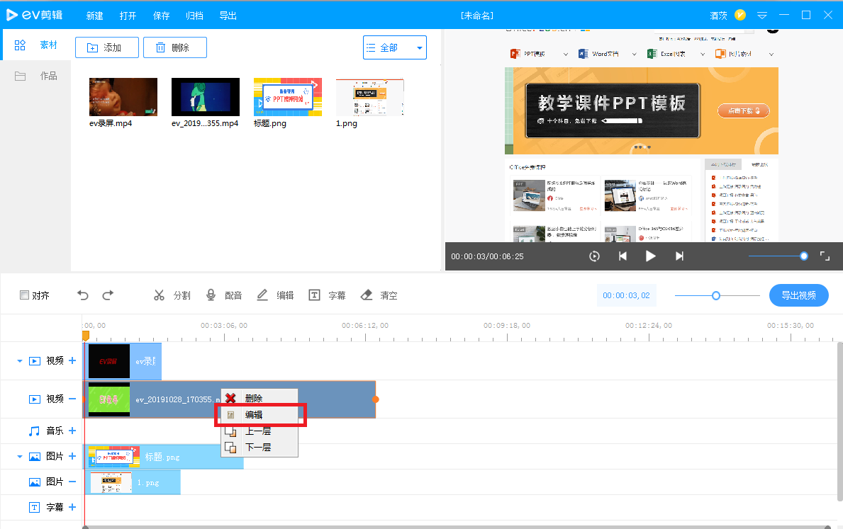 如图,这里有两段视频,选择其中一个,鼠标右击,弹出菜单,选择【编辑】,软件左上角就会出现编辑窗口,今天小编主要介绍如何设置画面裁剪、画面透明度、段落静音。