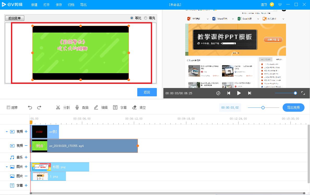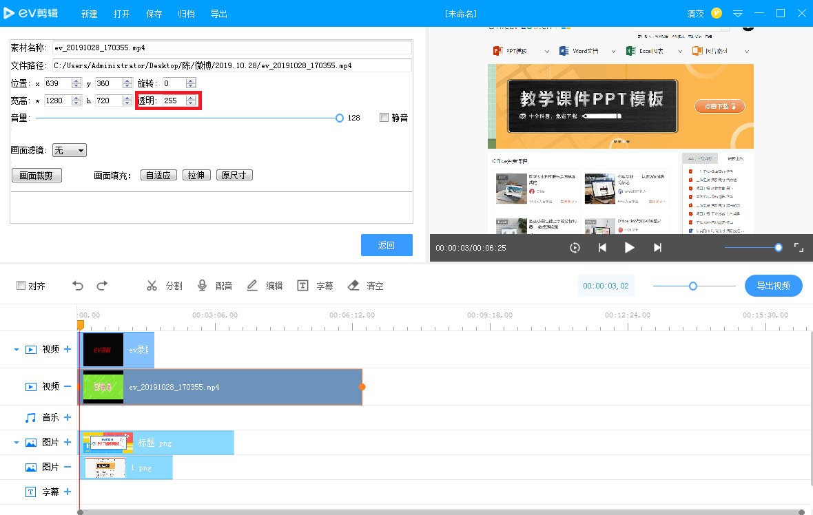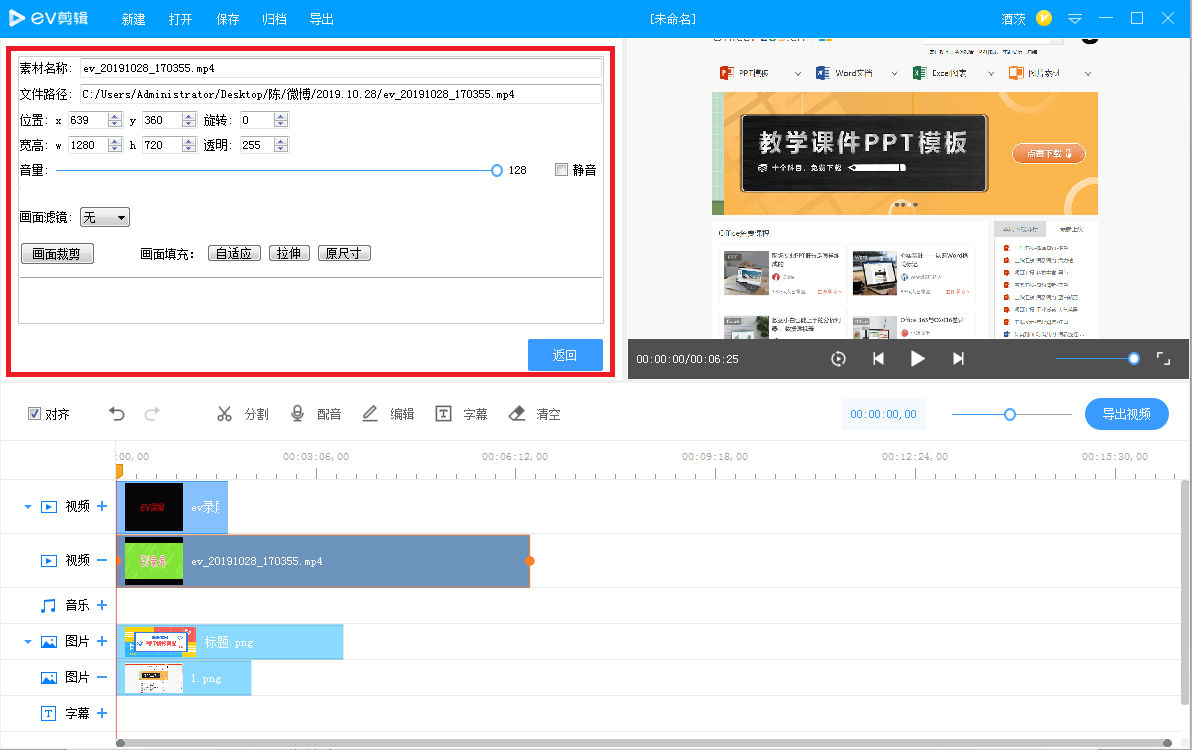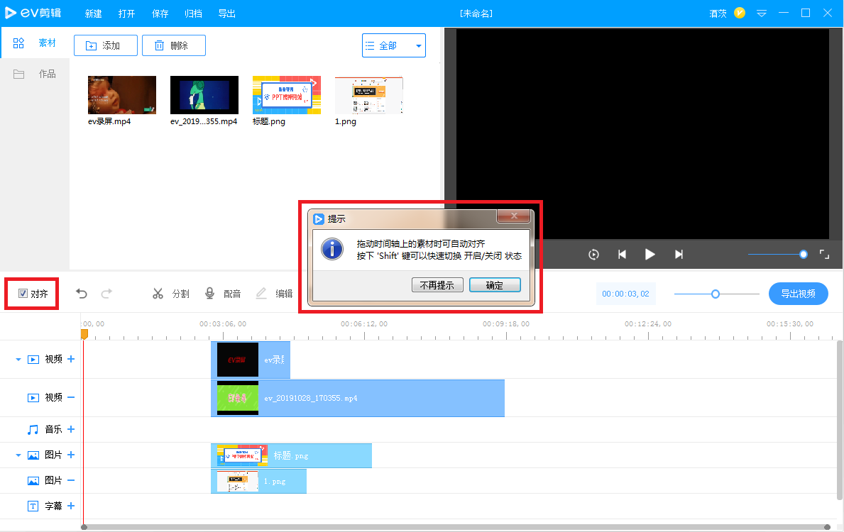 在多个轨道中添加素材,很难做到手动对齐,无妨,EV剪辑提供了辅助对齐功能,如图,勾选【对齐】,出现提示,拖动时间轴上的素材即可实现自动对齐,是不是很神奇?