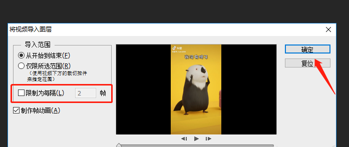 弹出【将视频导入图层】面板,如图,勾选【限制为每隔】,默认2帧,大家可以根据实际情况进行调节,做降帧处理,然后点击确定,
