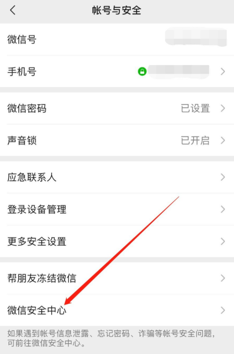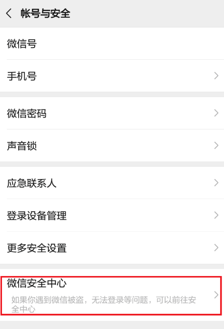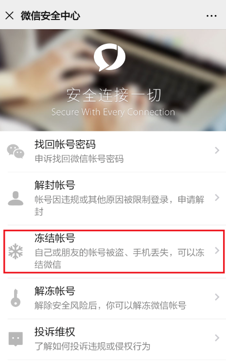 进入微信安全中心,如图,点击【冻结账号】,一旦遇到微信账号被盗、手机丢失等突发情况,即可冻结微信,