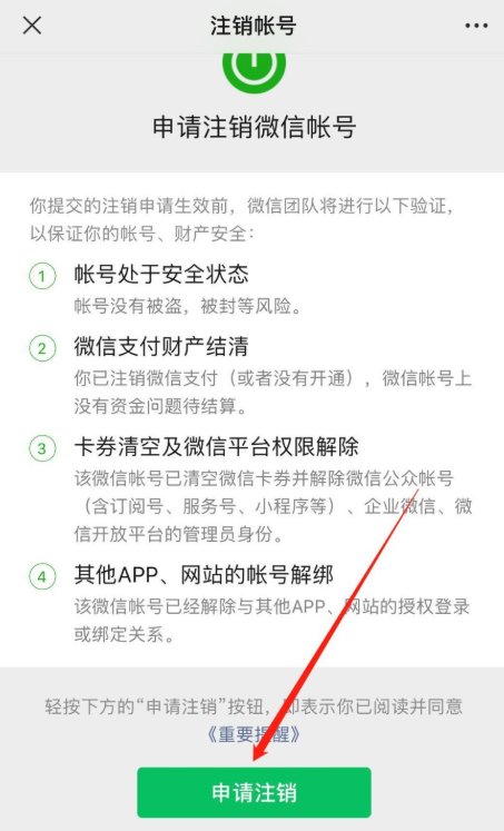个人申请注销微信账号必须符合官方要求,请仔细阅读,最后点击【注销申请】,根据提示操作即可。