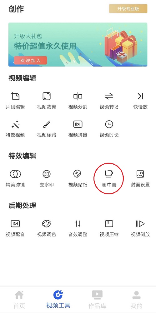 进入视频工具页面,点击【特效编辑】模块,找到【画中画】功能,