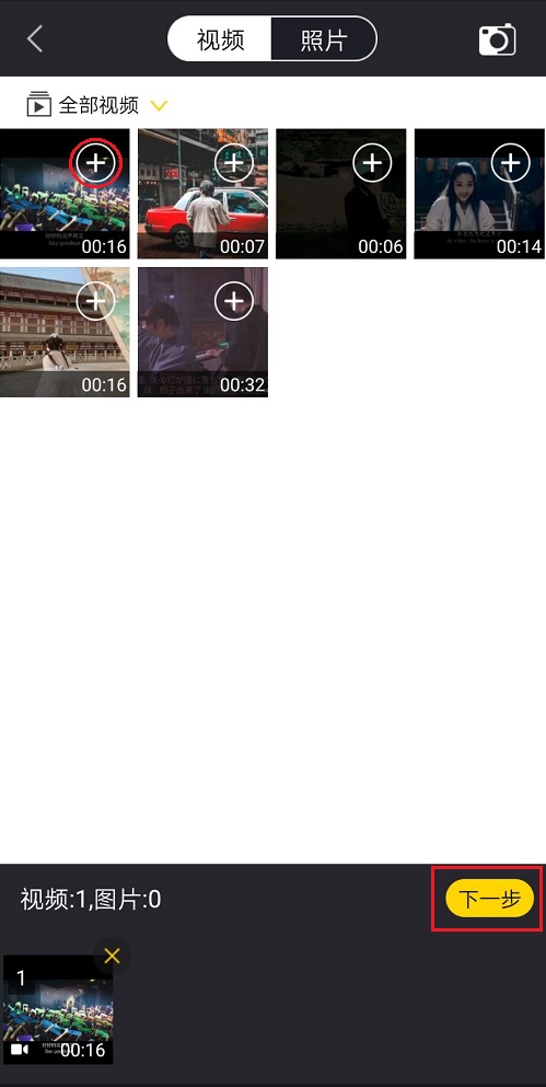 点击【画中画】,进入手机相册,如图,选择视频素材,点击【+】,然后进行下一步,