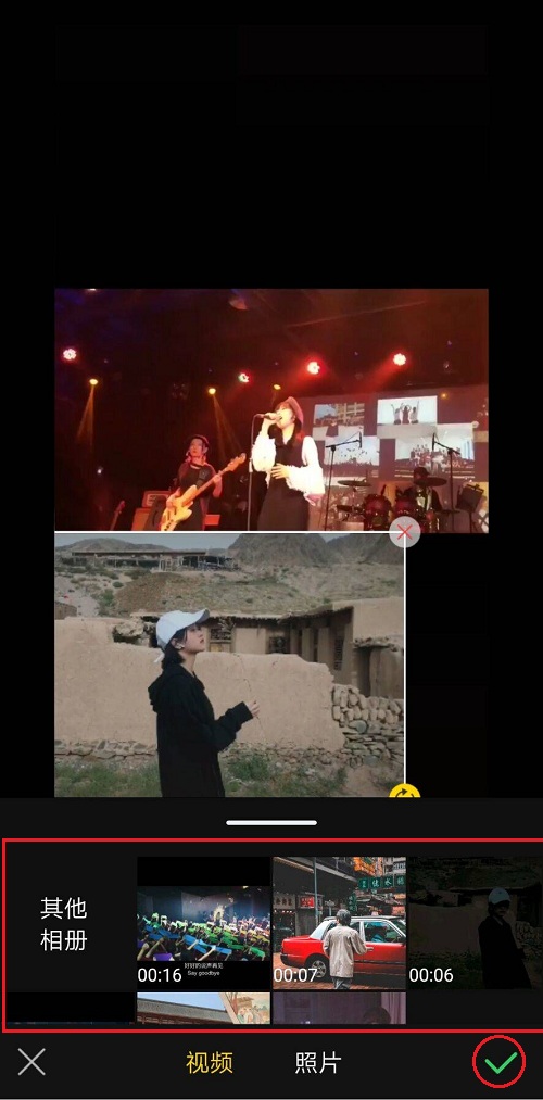 如图,在相册中选择需要添加的视频或者照片,点击添加至视频画面,长按将其拖动至合适位置,点击【√】,