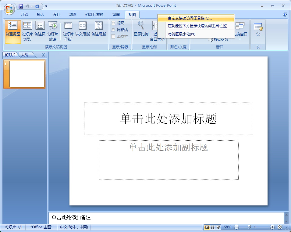 3、在工具栏“视图”右侧空白处右击,然后选择“自定义快速访问工具栏”。