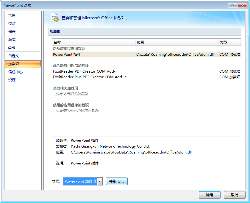4、弹出“PowerPoint选项”窗口,左侧选择“加载项”,然后右侧下方“管理”后选择“PowerPoint加载项”,最后点击“转到...”。
