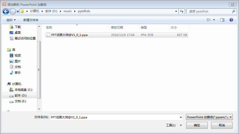 6、浏览之前下载备用PPT动画大师所在的文件夹,选中“PPT动画大师.ppa”程序文件,然后点击“确定”。