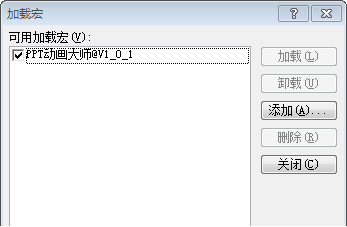 7、PPT动画大师插件被添加到加载宏中,点击“关闭”。