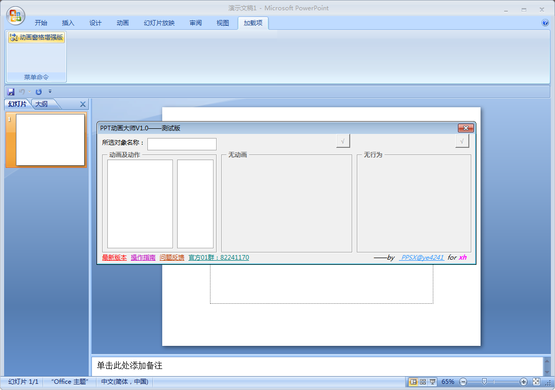 8、回到一开始新建的PPT文件界面,发现工具栏中多了一个“加载项”,选择它,点击其下选项“动画窗格增强版”,这样就打开了“PPT动画大师—测试版”。这样就可以对PPT进行动画操作了。