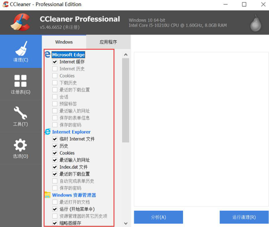 一般情况下,当进入CCleaner的清理功能操作界面后,它默认勾选的浏览器缓存数据都是可以放心清理的,用户如果没有特别的需求,直接点击运行清理即可。