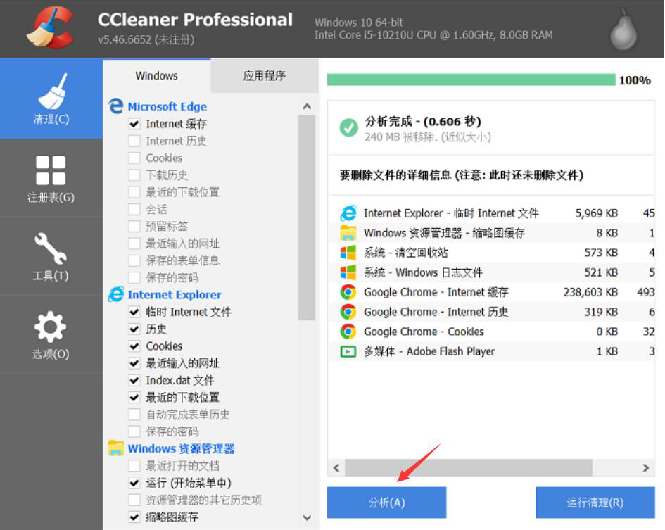 3、接下来,点击“分析”按钮,CCleaner便会将用户勾选的需要清理浏览器的缓存内容的信息展示出来。从中,用户可以看到各自的空间占用情况,也可以再次确定自己需要使用CCleaner清理常用浏览器的缓存数据是否都被勾选了。