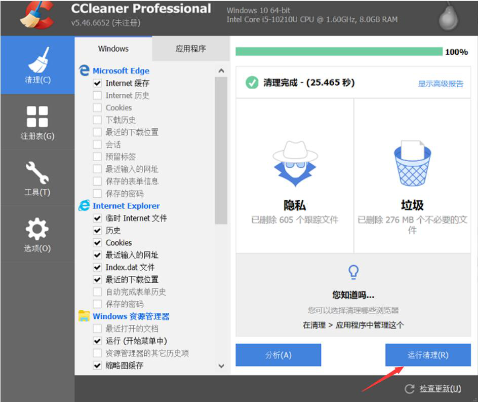 4、最后,点击“运行清理”的按钮,CCleaner便会执行清理常用浏览器缓存数据的指令。