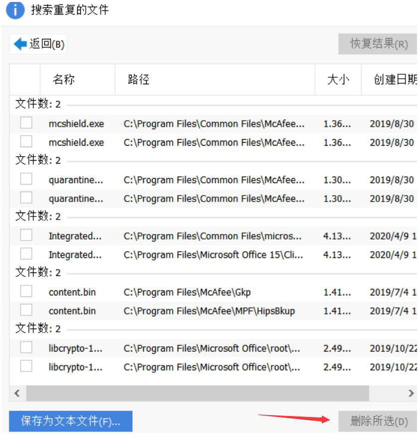 6、最后,CCleaner完成查找重复文件,便会弹出如下图的重复文件的列表。用户勾选自己所要删除的重复文件,再点击右下方的“删除所选”按钮,CCleaner便会执行将这些重复文件删除的指令。