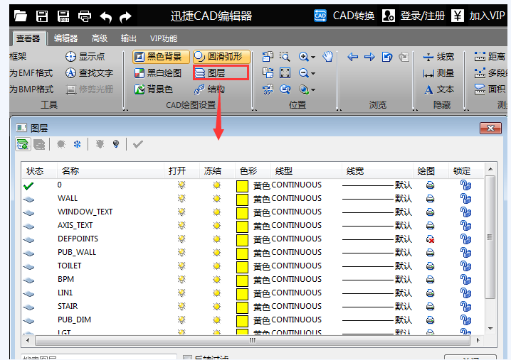 进入【CAD绘图设置】功能区,点击【图层】,打开图层设置窗口,
