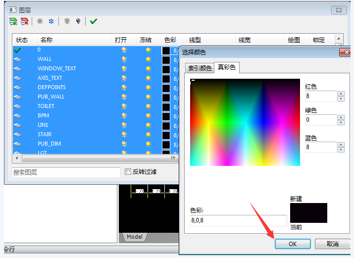 选择第一个图层,按住shift键,接着点击后面一个图层,进行全选,然后修改图层颜色(这里选择的是黑色),点击OK,