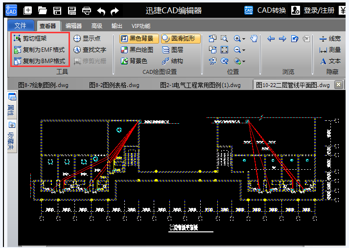 回到主页,移动鼠标全选图纸,也可以按快捷键【Ctrl+A】,然后在工具栏中找到【剪切框架】、【复制为EMF格式】、【复制为BMP格式】这三个功能,