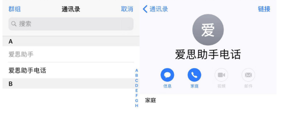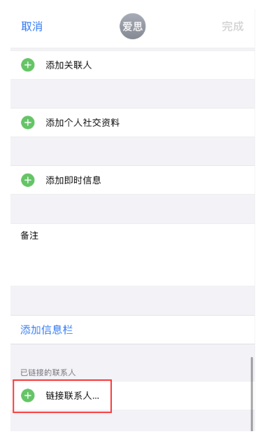 3、在通讯录列表中选择需要链接的指定对象,如图,点击右上角的【链接】,最后点击完成,即可合并重复联系人。