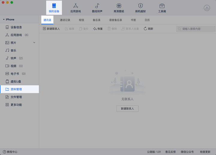 本文就以爱思助手Mac版为例,先将设备与电脑连接,打开软件,进入界面,点击【我的设备】——【资料管理】,选择通讯录,