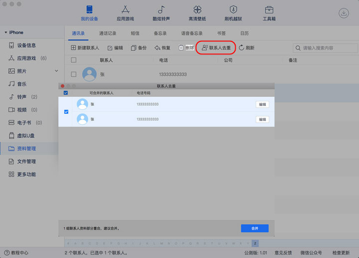 如果通讯录中重复的联系人较多,可以将iPhone手机连接到电脑,通过爱思助手的“联系人去重”功能快速去重。