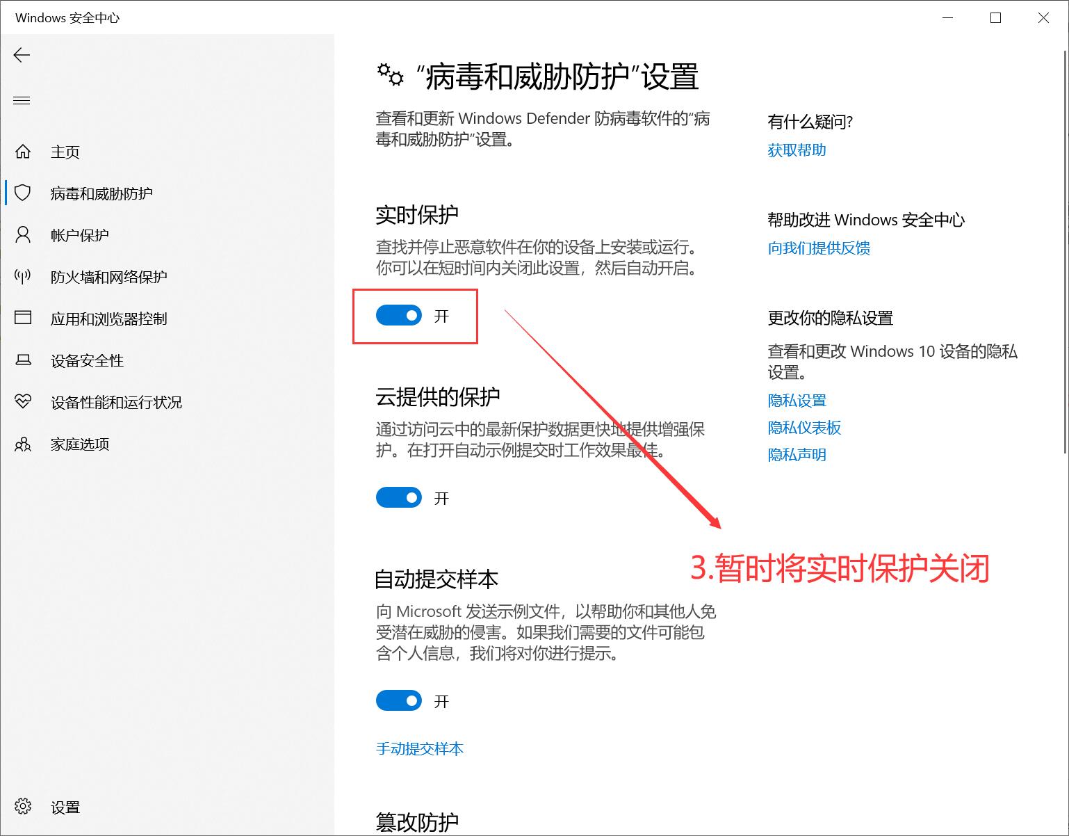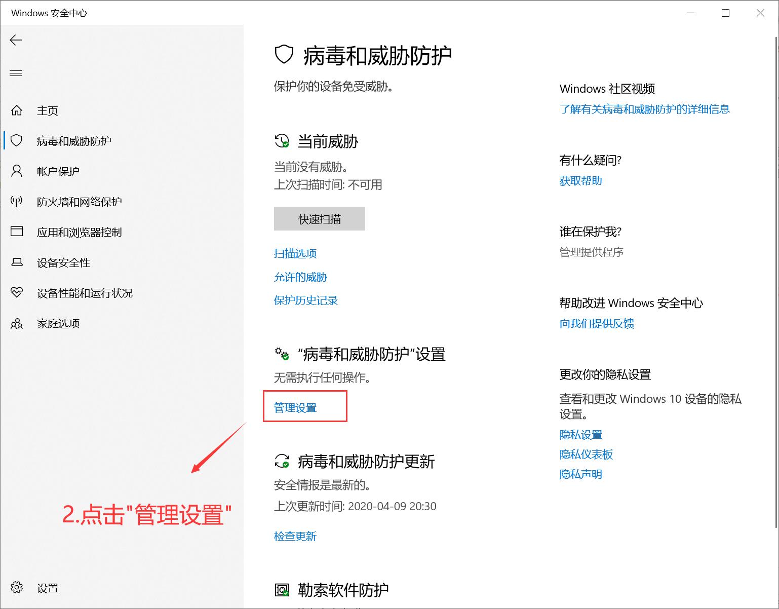 在左侧栏点击【病毒和威胁防护】,展开如图窗口,然后点击【管理设置】,你可以看到【实时保护】功能默认开启,暂时将其关闭,