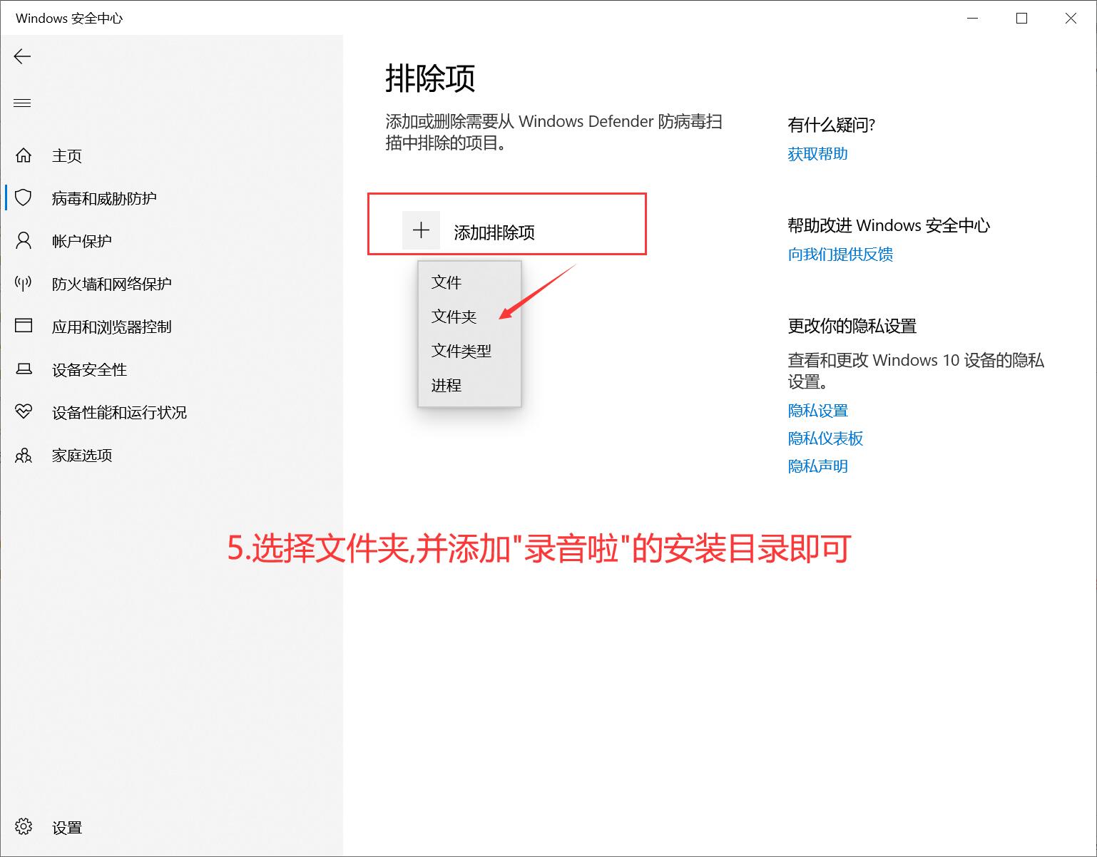 如图,点击【添加排除项】,选择【文件夹】,添加录音啦软件的安装目录,