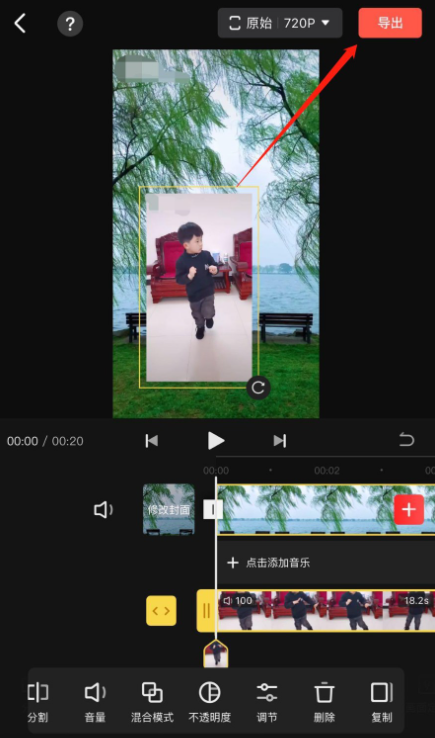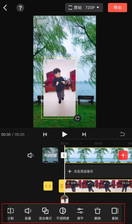 进入剪辑界面,如图,调整视频位置和大小,点击底部的各种工具选择,你可以设置视频音量、混合模式、不透明度等,