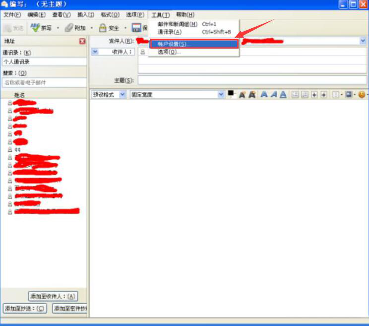 3、在新建的邮件界面中,从其菜单栏的“工具”中点击“账户设置”,从而进入mozilla thunderbird设置邮件回执的界面。