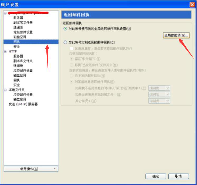 4、接下来,在mozilla thunderbird的账户设置界面中,点击左侧栏中的“回执”,并在其对应的返回邮件回执设置窗口中,勾选“对此账号使用我的全局返回邮件回执设置”,再点击“全局首选项”的按钮。