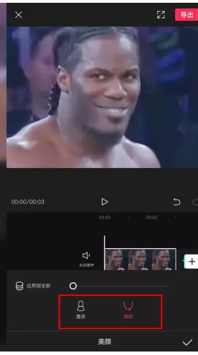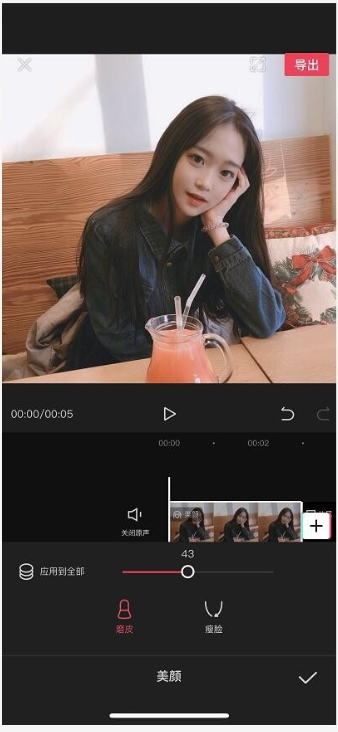 点击【美颜】,展开菜单,你可以选择【磨皮】或者【瘦脸】,拖动滑块,进行设置调节,最后点击√,导出视频。