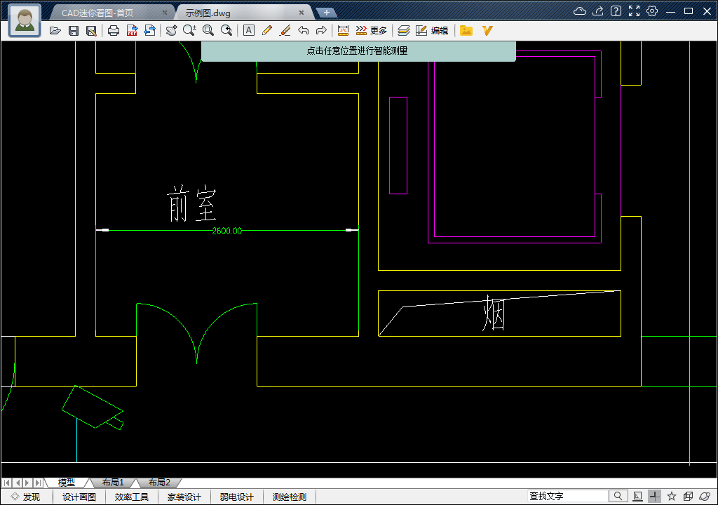 3、然后在图形中选择要测量长度的起点和终点。比如我们要测量“前室”的东西长度,根据图形方位上北下南的一般规定,分别选取前室东西内墙,测得前室东西内间距长度为2600mm。