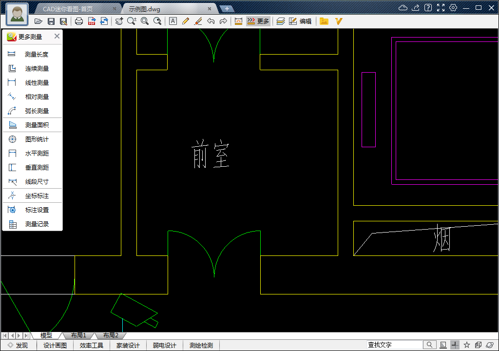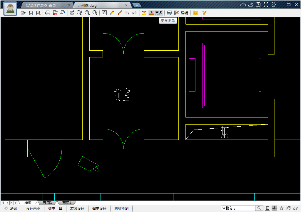 4、继续以“前室”为例,测量其面积。点击上工具栏中【更多测量】。