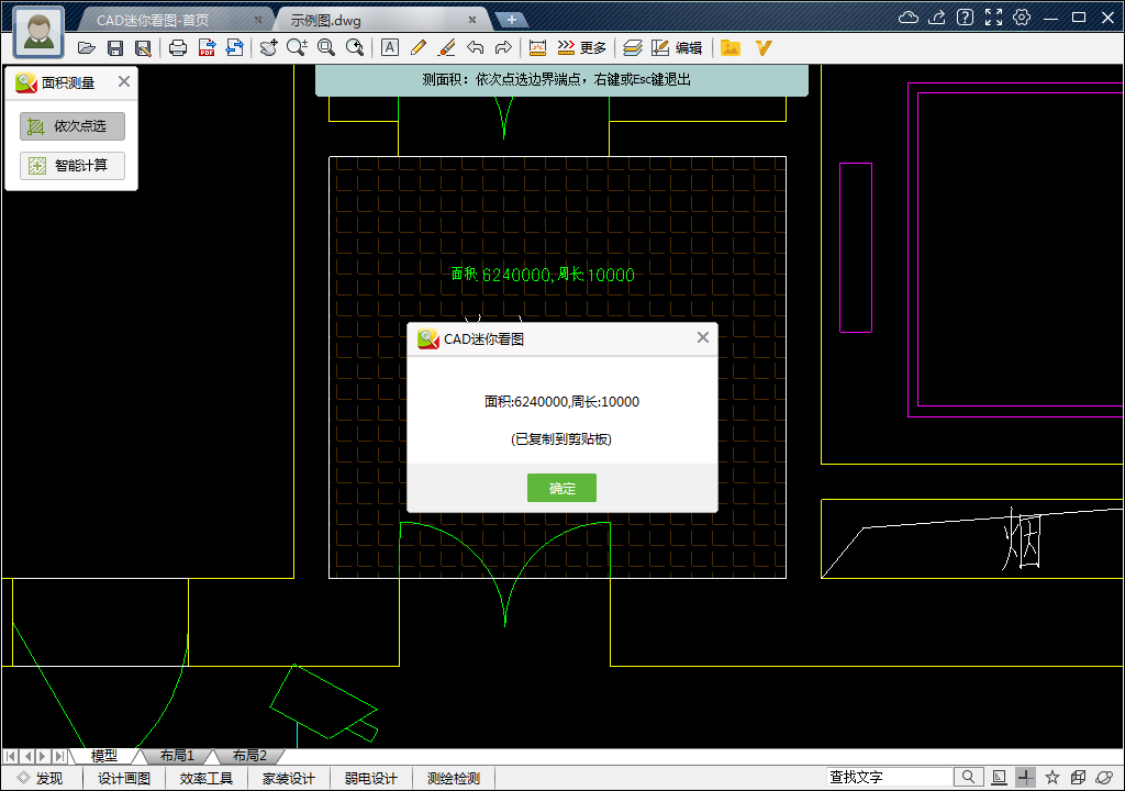 8、最后得到前室面积和周长,该数据直接复制到剪切板,方便用户粘贴到其他文件。