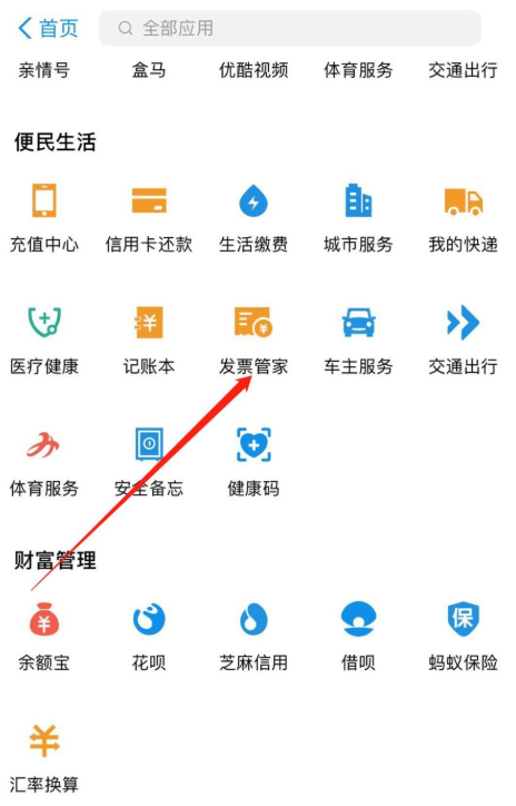 然后点击【便民生活】——【发票管家】服务功能,