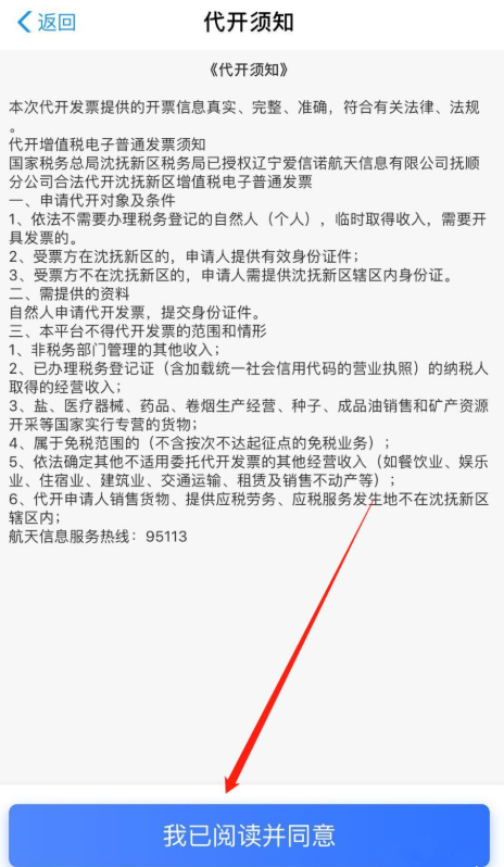 查看【代开须知】,了解相关说明,然后点击【我已阅读并同意】,