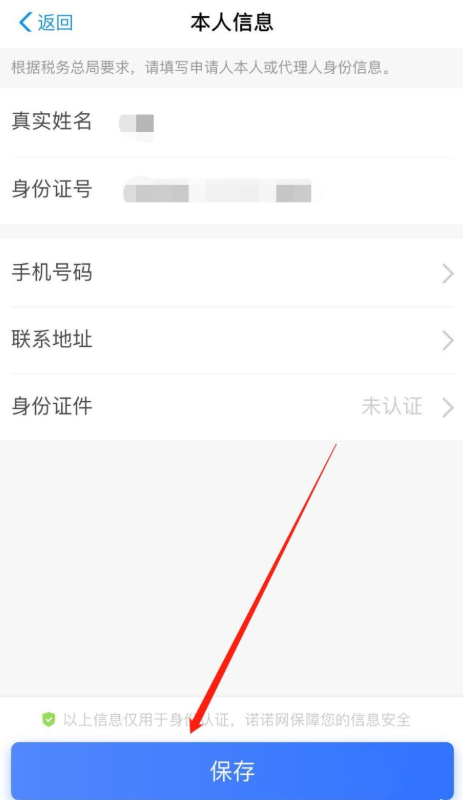 最后,填写本人信息,点击【保存】,即可使用支付宝进行发票代开。