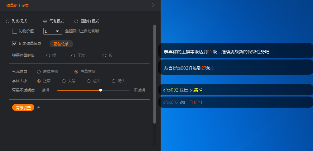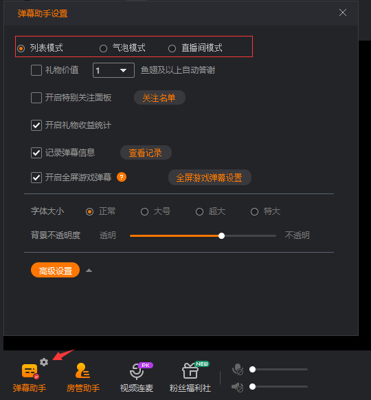 一、点击弹幕助手右上角小齿轮,弹出弹幕助手设置窗口,可发现三种模式:列表模式、气泡模式、直播间模式,下面分别介绍:
