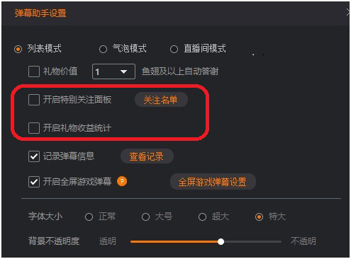2、特别请关注面板主要是对重点粉丝进行弹幕请关注,而礼物收益统计主要帮助主播统计直播期间礼物情况,注意,这两个功能只能在列表模式下开启。