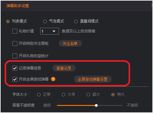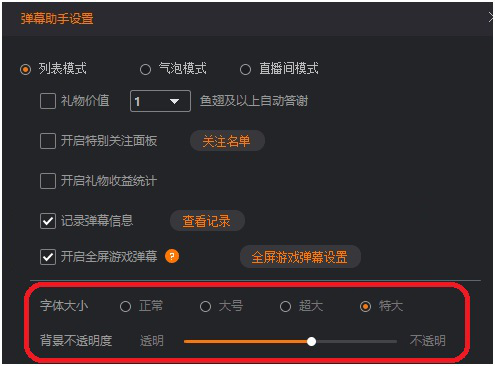 4、弹幕字体大小和背景透明度可以分别在字体大小和背景不透明度两栏进行设置。