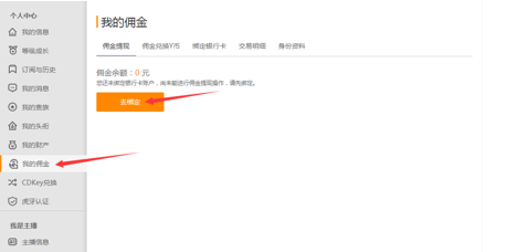2、点击左侧菜单栏中的【我的佣金】,然后点击右侧【去绑定】,按提示绑定主播个人基本资料和银行卡信息。