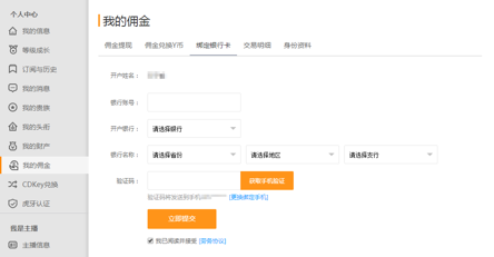 1)绑定银行卡的用户名必须与认证主播时提交的信息一致。
