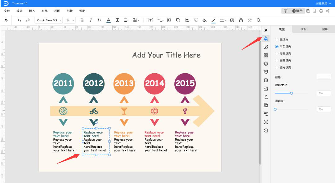 3、接下来,如果要修改PPT时间线图模板中的文本颜色,就先点击该部分文本内容,再点击右侧属性面板中的填充工具,设置颜色、阴影、色调、透明度等等。双击文本并输入新的文本内容,便可以生成属于自己的PPT时间线图。