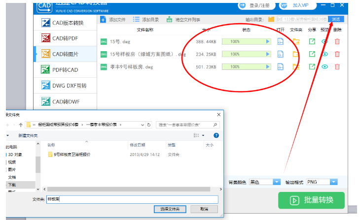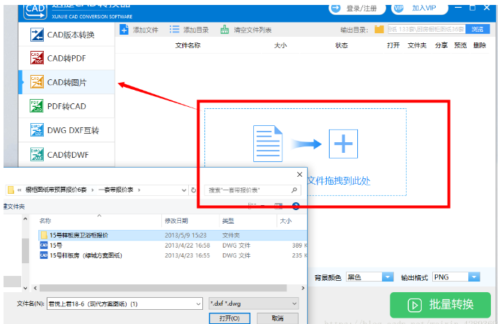 CAD图纸文件上传之后,点击左上方的【添加文件】,你还可以继续添加文件进行批量转换,在下方选择输出格式为PNG,点击【批量转换】,