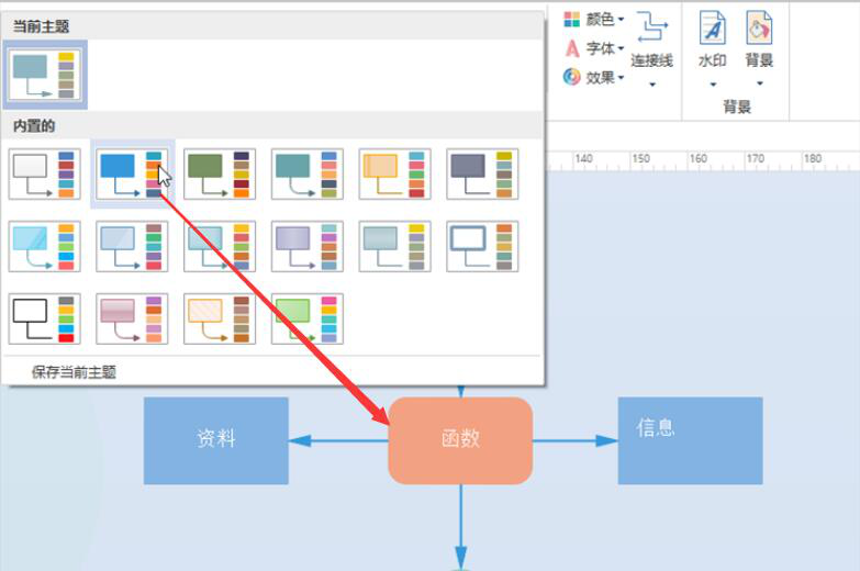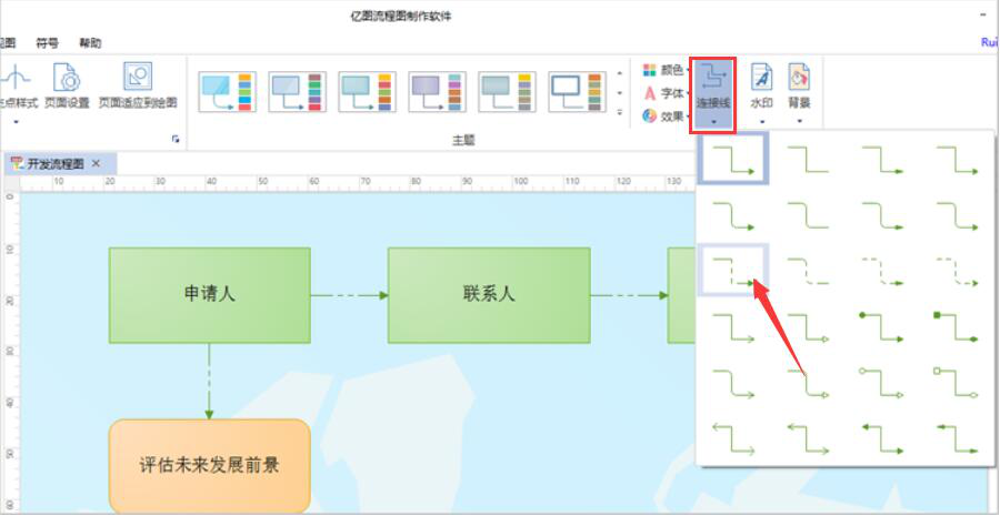 6、当亿图图示基本完成流程图的绘制后,用户还可以对该流程图进行美化。例如可以点击页面布局中的“主题”,从主题库中选择自己想要的样式来应用。这样一来,自己所绘制的流程图就会看起来感觉更专业更清晰。