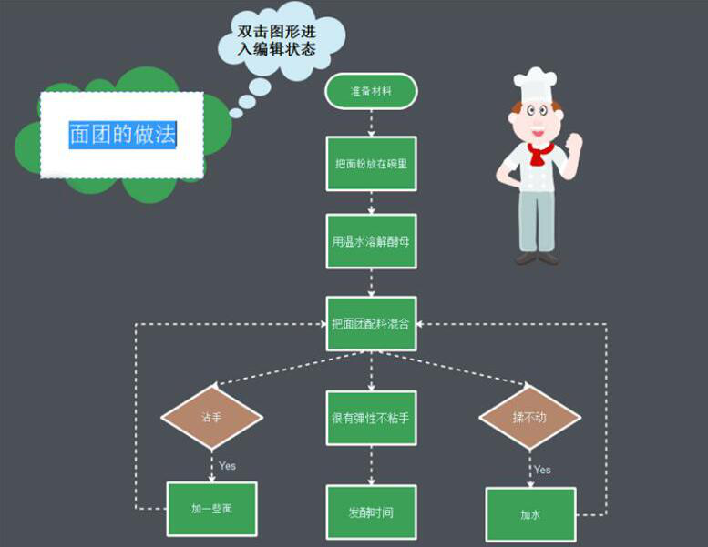 4、用亿图图示来绘制流程图的时候,我们如果需要更改文本的内容。那么就双击流程图的图形,当进入编辑状态时,就手动输入文本,再点击绘图区域的空白区域,文本便修改成功。